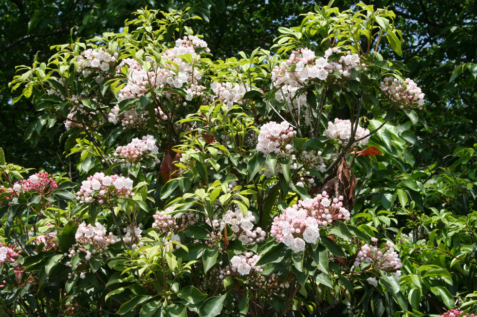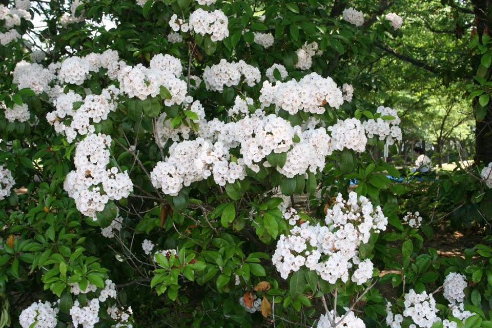 5・23カルミア1園中央にあるトッピー広場のアメリカシャクナゲ(カルミア)の花もきれいに咲きそろいました。「きれいね」とお客様も近づいてながめていらっしゃいます。