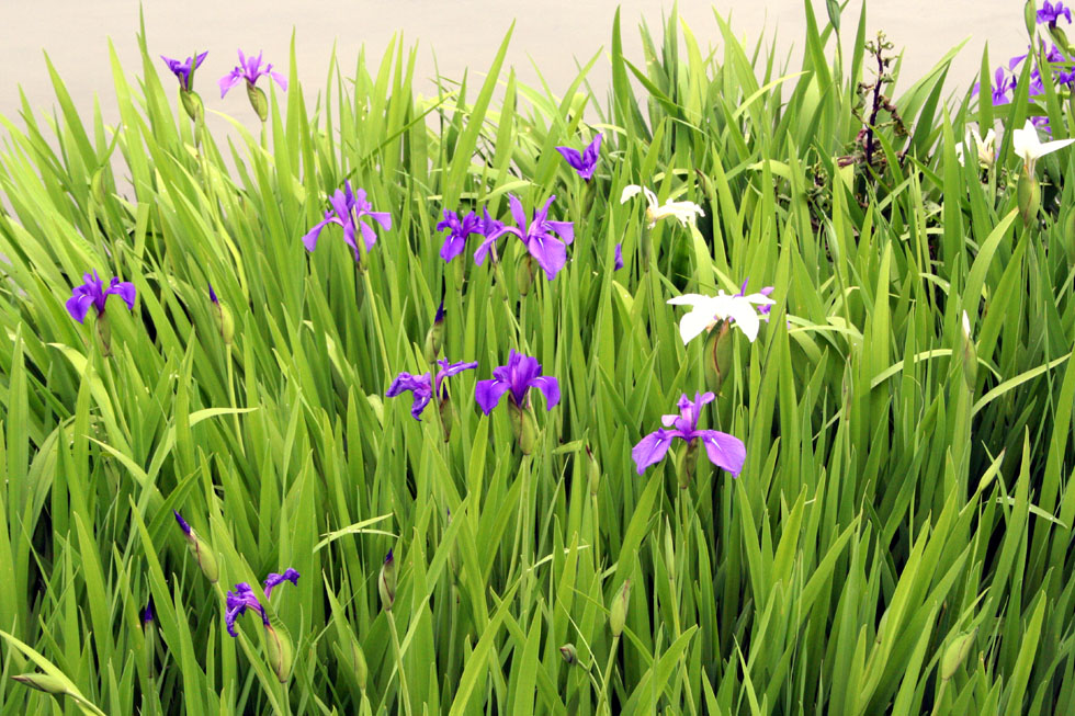 5・14カキツバタ1ピラカンサに囲われた池の中には、カキツバタが植えてあり、こちらも色とりどりの花を咲かせています。今が見ごろです。