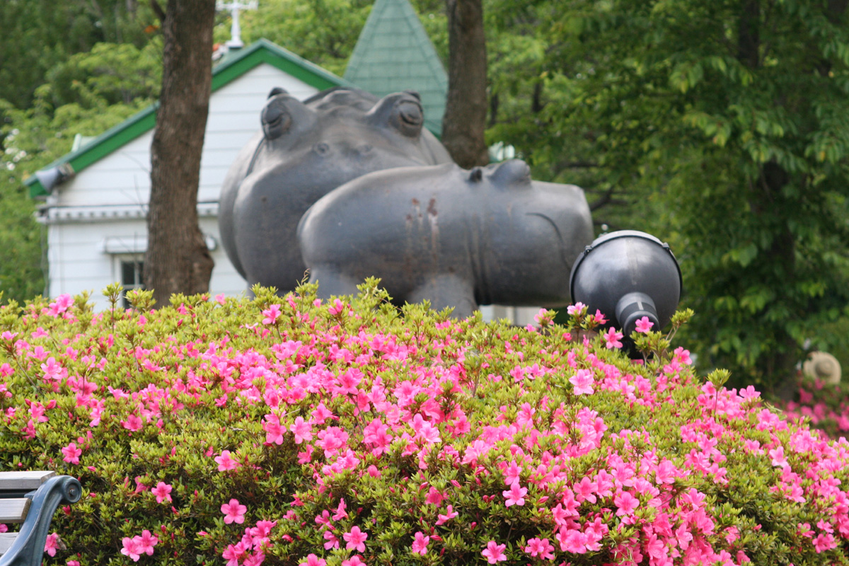 5・28カバサツキ東ゲートを入ったところにあるカバ像をかざるサツキです。このカバ像は園内一番の記念撮影スポットです。カバ像といえばカバ園長で親しまれた西山園長を思い出します。今でもなつかしそうにカバ園長のことを語られるお客様がおおぜいいらっしゃいます。