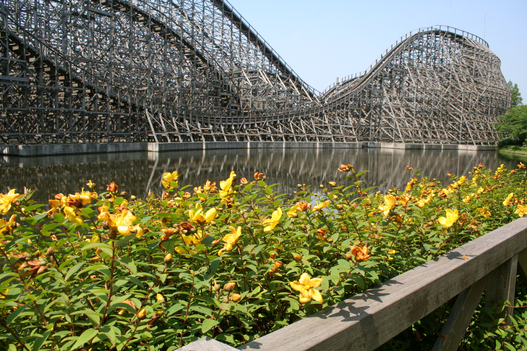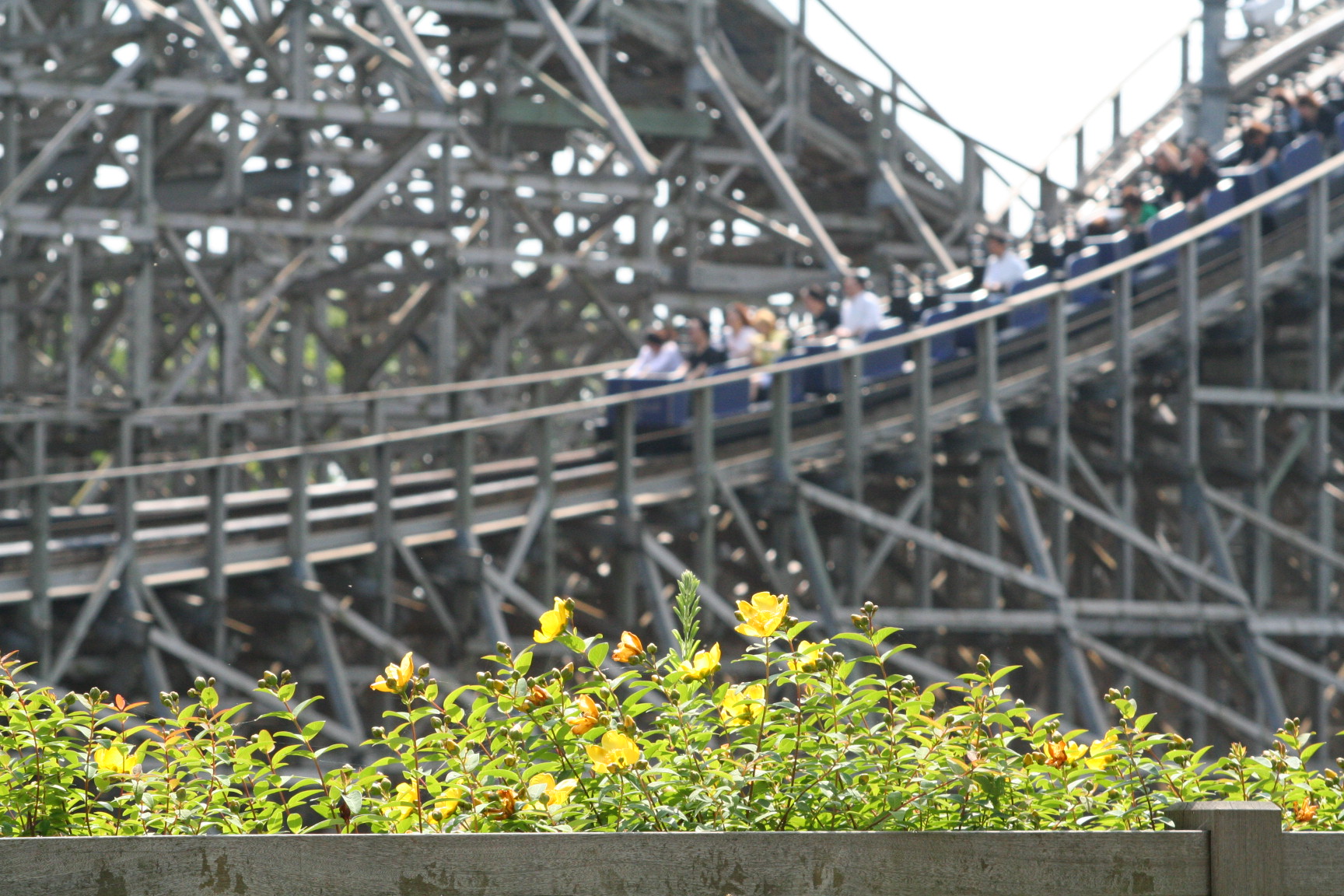 6・2レジーナヒペリカム待っているとコースターが走ってきました。楽しそうな歓声が響いてきます。