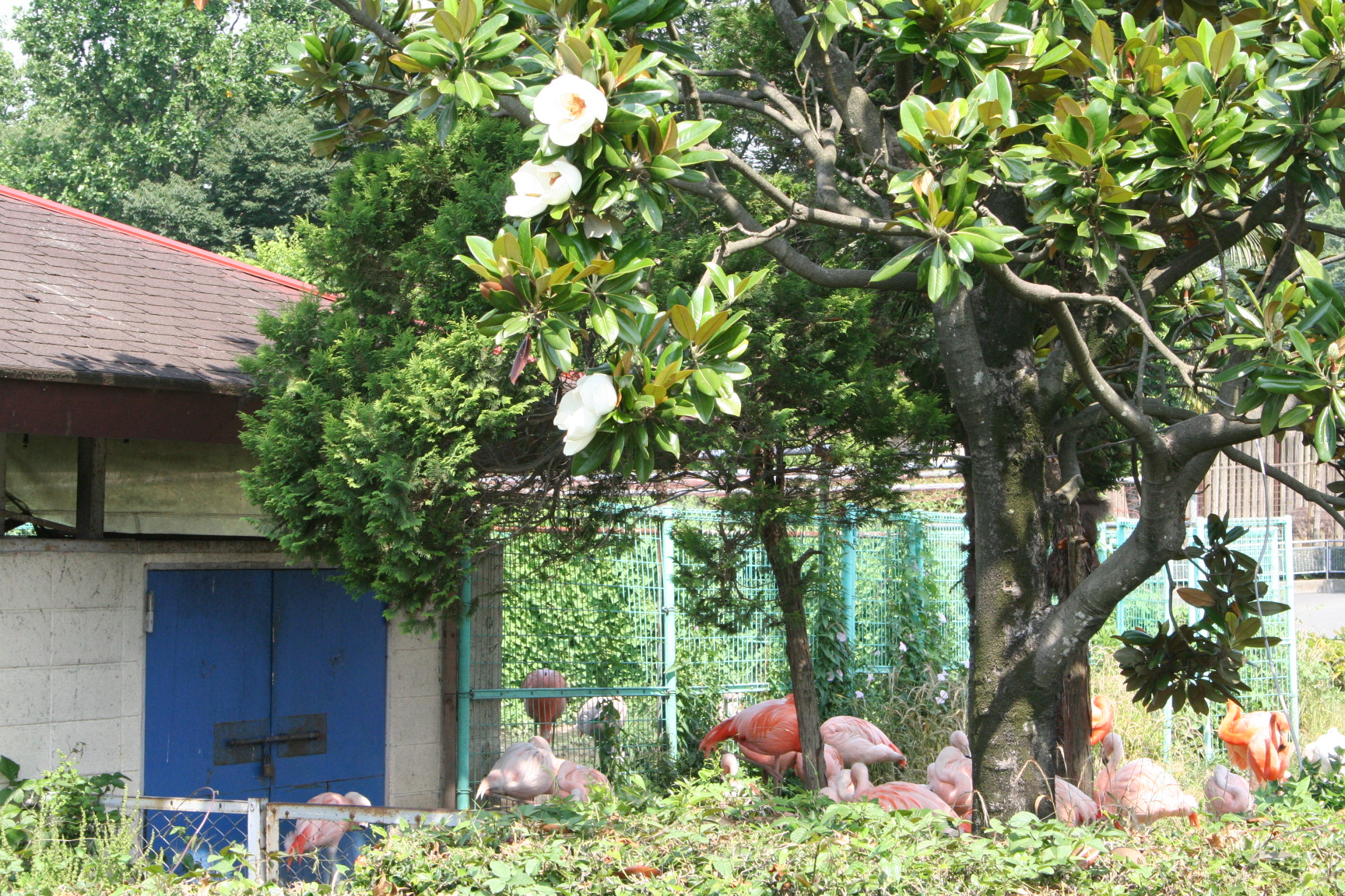 6・12タイサンボクフラミンゴの池には大きなタイサンボクの木があり、日差しの強い日にはその木陰でたくさんのフラミンゴたちが羽を羽を休めています。