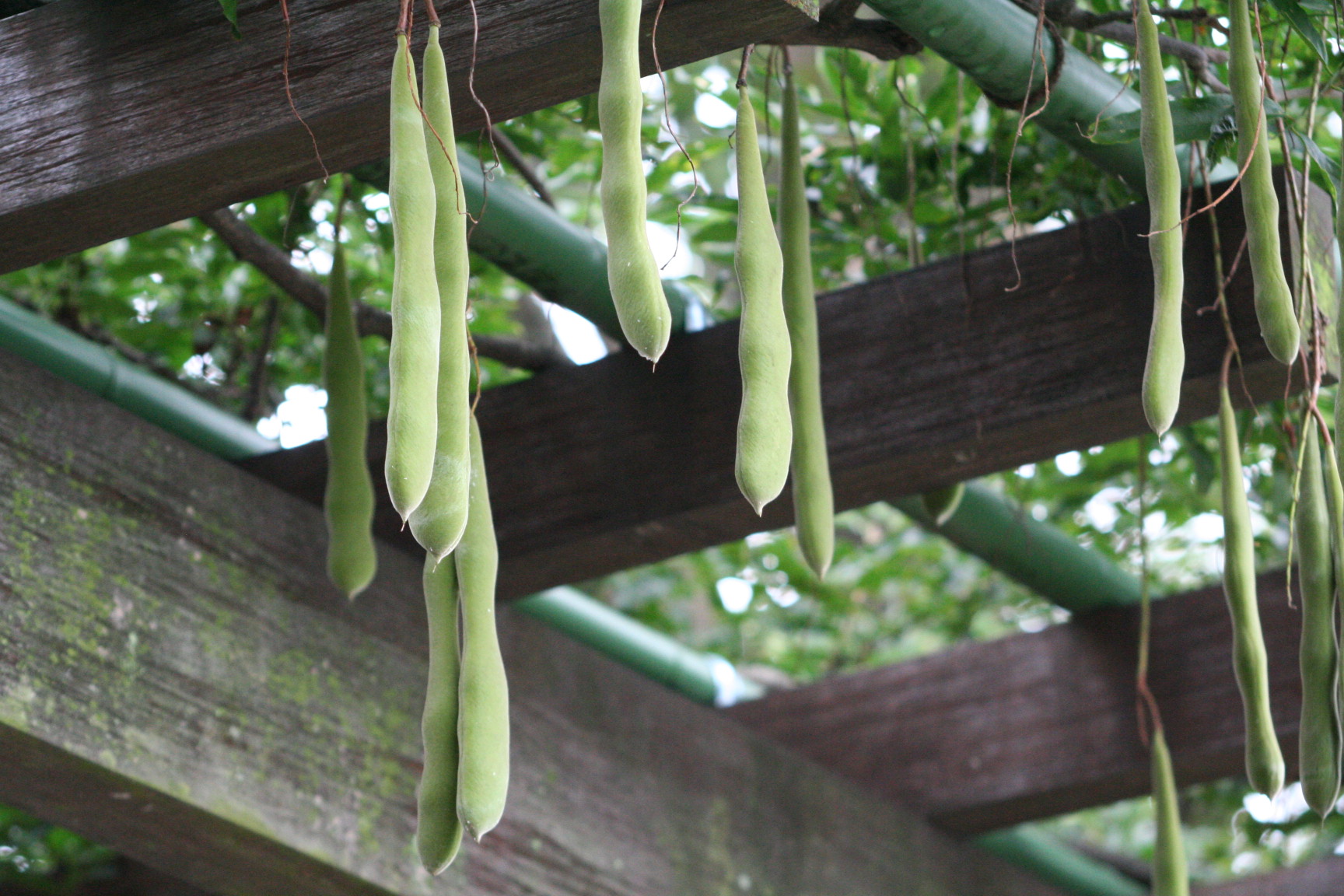 まずはすでにご紹介したサンゴジュです。赤い珊瑚玉のような実はほんとうに珊瑚の玉のようですね。右はフジの実です。大きな豆のようですね。