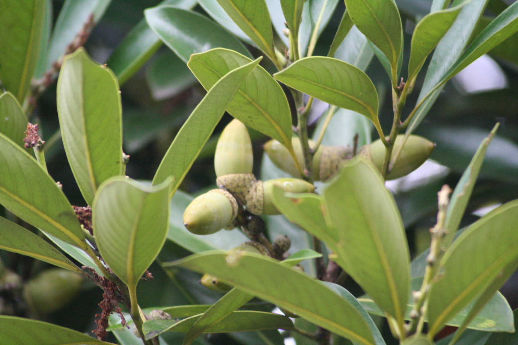 動物園ゾーンのふれあい動物村入口のユリノキも実をつけていました(下左)。そして秋の遠足で子どもたちが楽しみにしているのがドングリ拾いですが、たくさんあるアラカシやマテバシイもたくさん実をつけて秋を待っています。