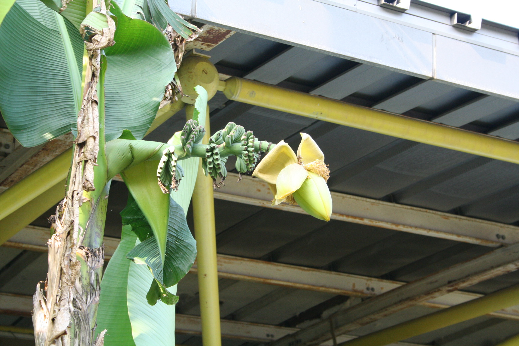 そのプールのエントランス前には大きなバショウが植わっていますが、今花を咲かせています。見ると「えっ!これが花?」という感じでちょっとびっくりしますョ。そしてプールの前にあるバードドームのまわりにはクチナシが咲いています。今回はその中から八重のものを選んでみました。