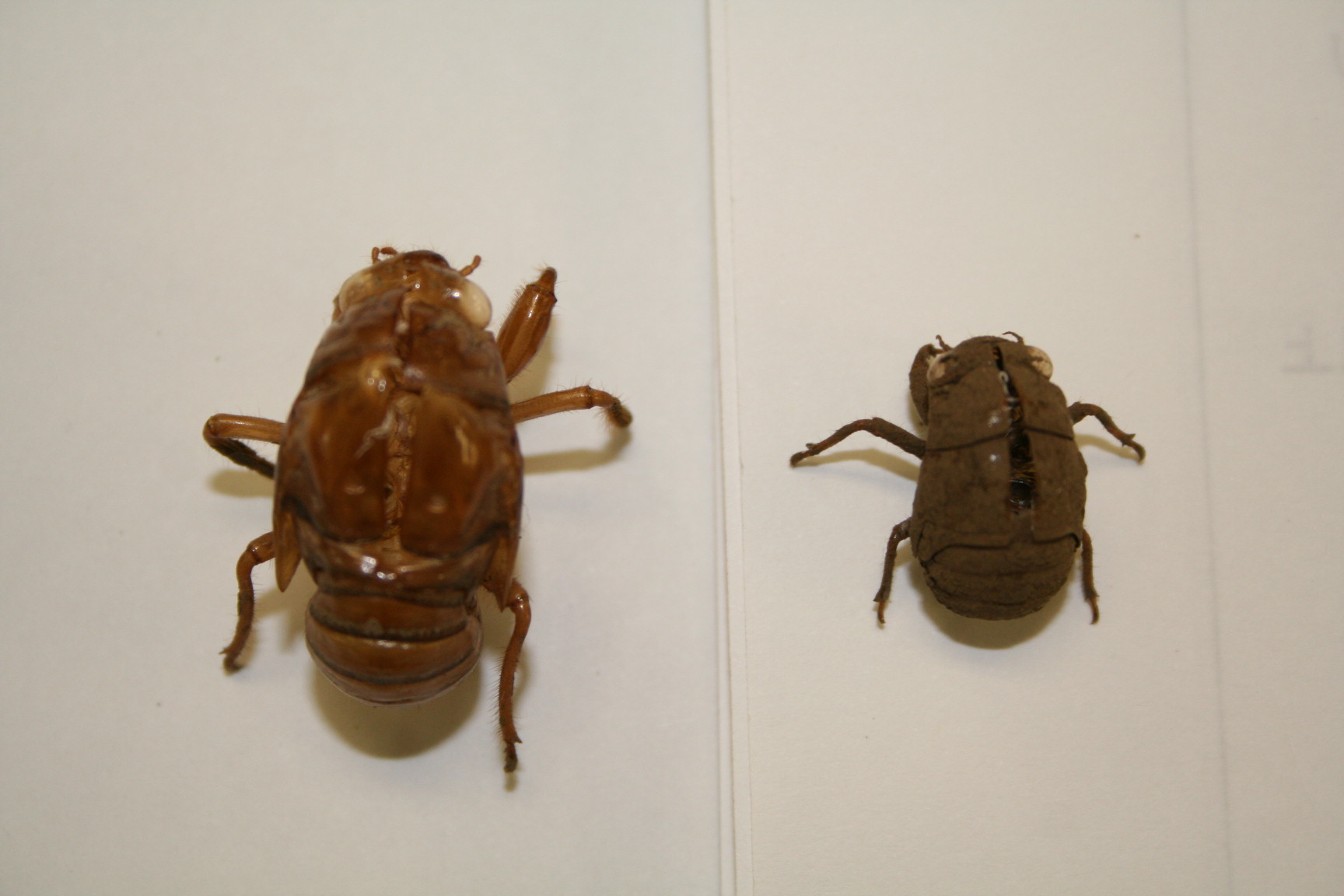 またセミかといわれそうですが、ニイニイゼミの抜け殻を見つけたので、アブラゼミのと並べてみました。右がニイニイゼです。アブラゼミのはちょっと探せば次々にみつかりますが、ニイニイゼミのは少ないし色も地味なのでなかなか見つからないかもしれません。エヘン!(笑い)