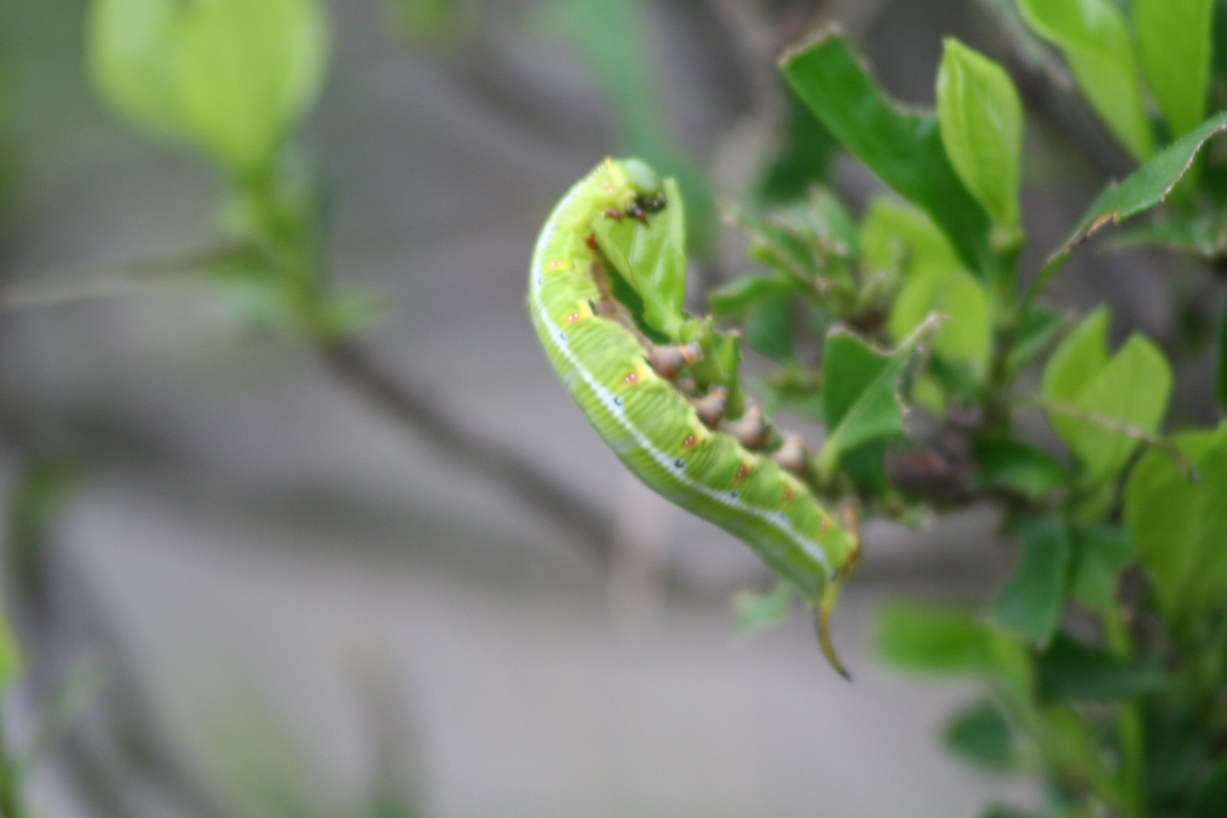 クチナシが色づくと草木染を染料になるそうですが、まだ緑のままです。なんだか葉がなくなっていると思ったらたいへんだぁ! オオスカシバの幼虫がもりもり食べてしまっていました。