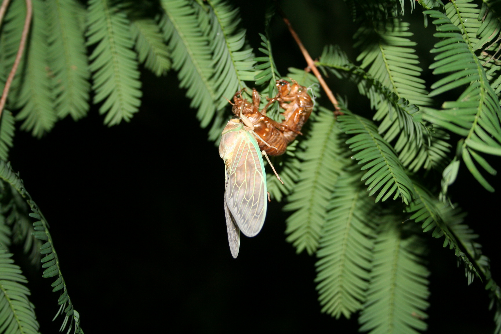 そこで花火の打上げが終わったころなら脱皮中のセミが見つかるのではないかと、メタセコイアの木を調べてみました。いましたいました。ご覧のように脱皮し始めのものやすでに羽がまっすぐに伸びたものなどいろいろ見つかりました。