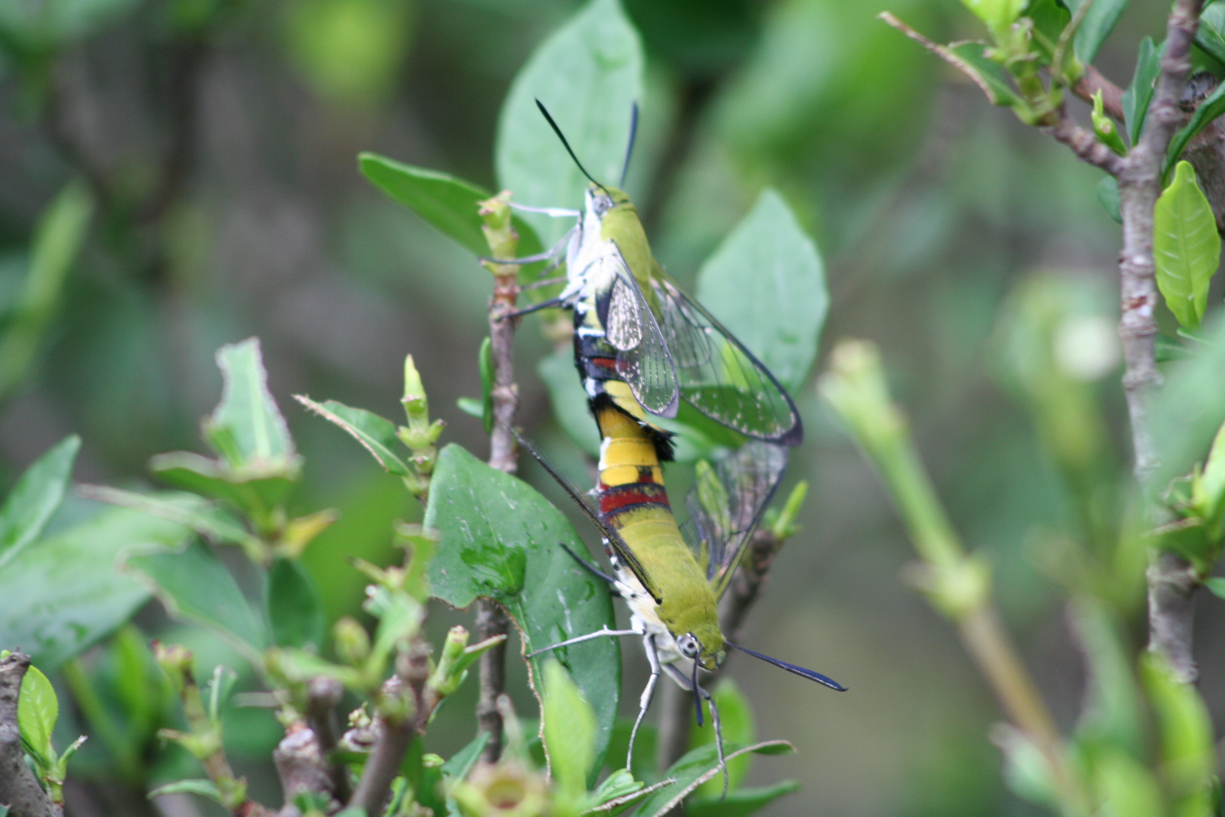 かわいそうですが、さっそく駆除。ところがふと見ると早くも成虫が交尾をしているではありませんか。駆除のためにインターネットで調べたのでわかりましたが、とても蛾とは思えません。透明な羽でハチかアブのように見えます。