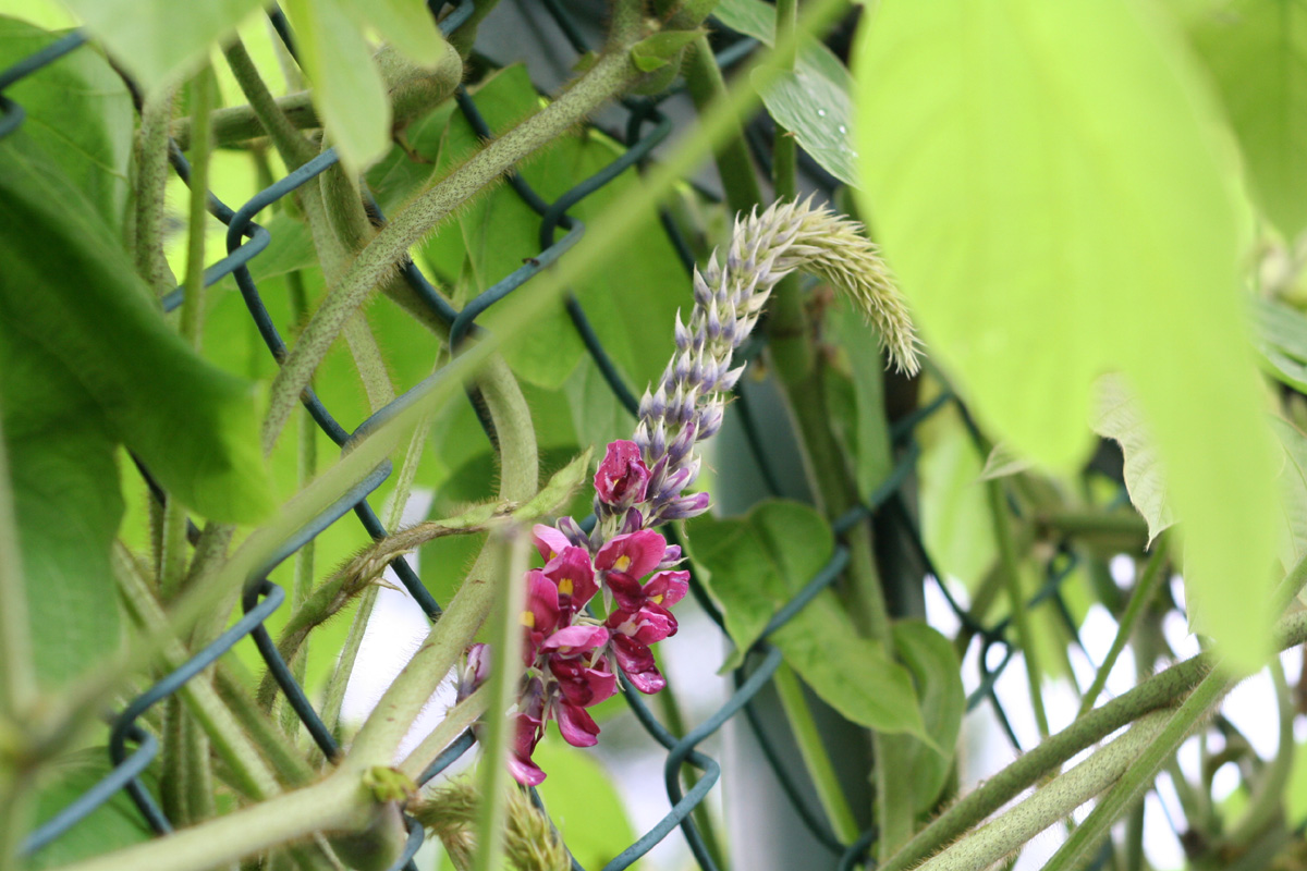 そこで先取りして秋の話題。園のフェンスにからみつくクズの蔓は実にやっかいものですが、その蔓に花がついていました。クズ(葛)は秋の七草のひとつですね。もうそこまで秋がやってきているようです。