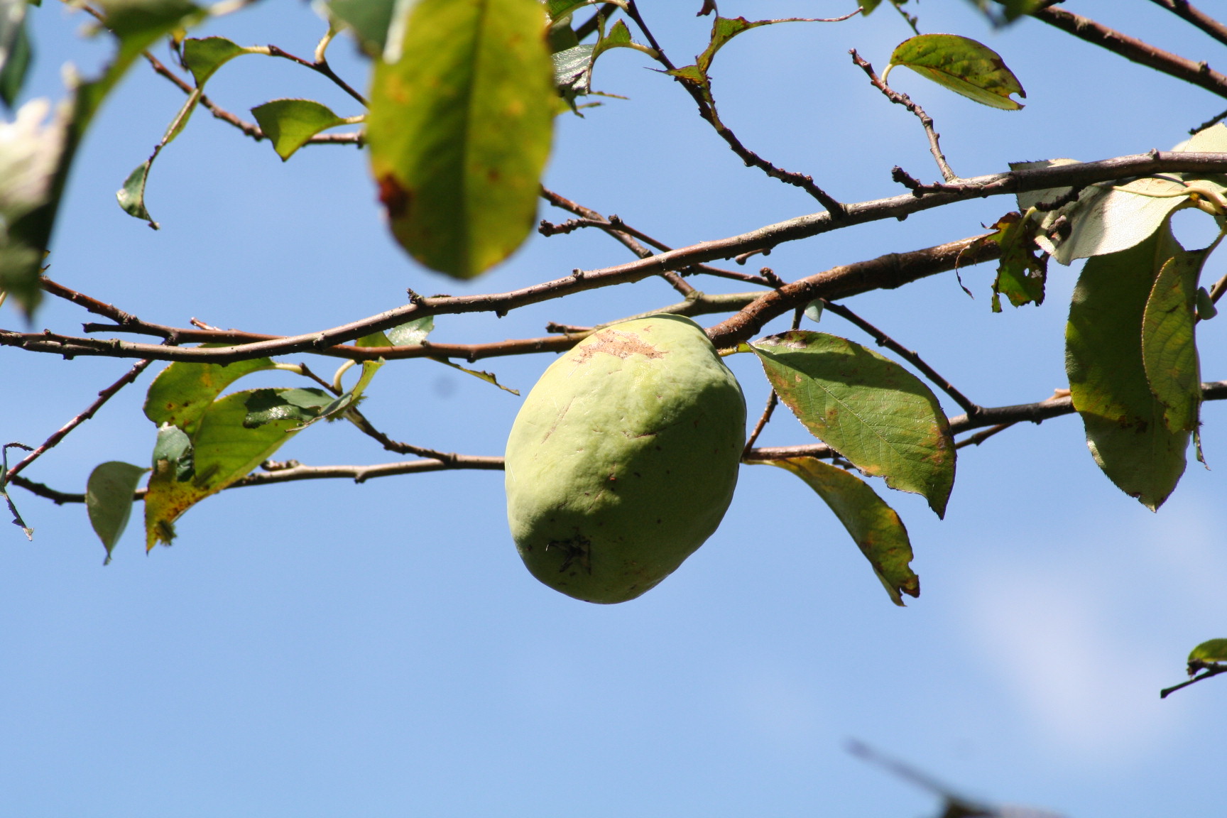 遠足の子どもたちの昼食場所になるトッピー広場の片隅のボリビアリスザルの島の近くには、カリンの木がたくさんあります。まだ色づいていませんが、よく見るともうかなり大きくなった実がついています。そしてそのとなりにはヒメリンゴ。こちらもまだ緑色です。
