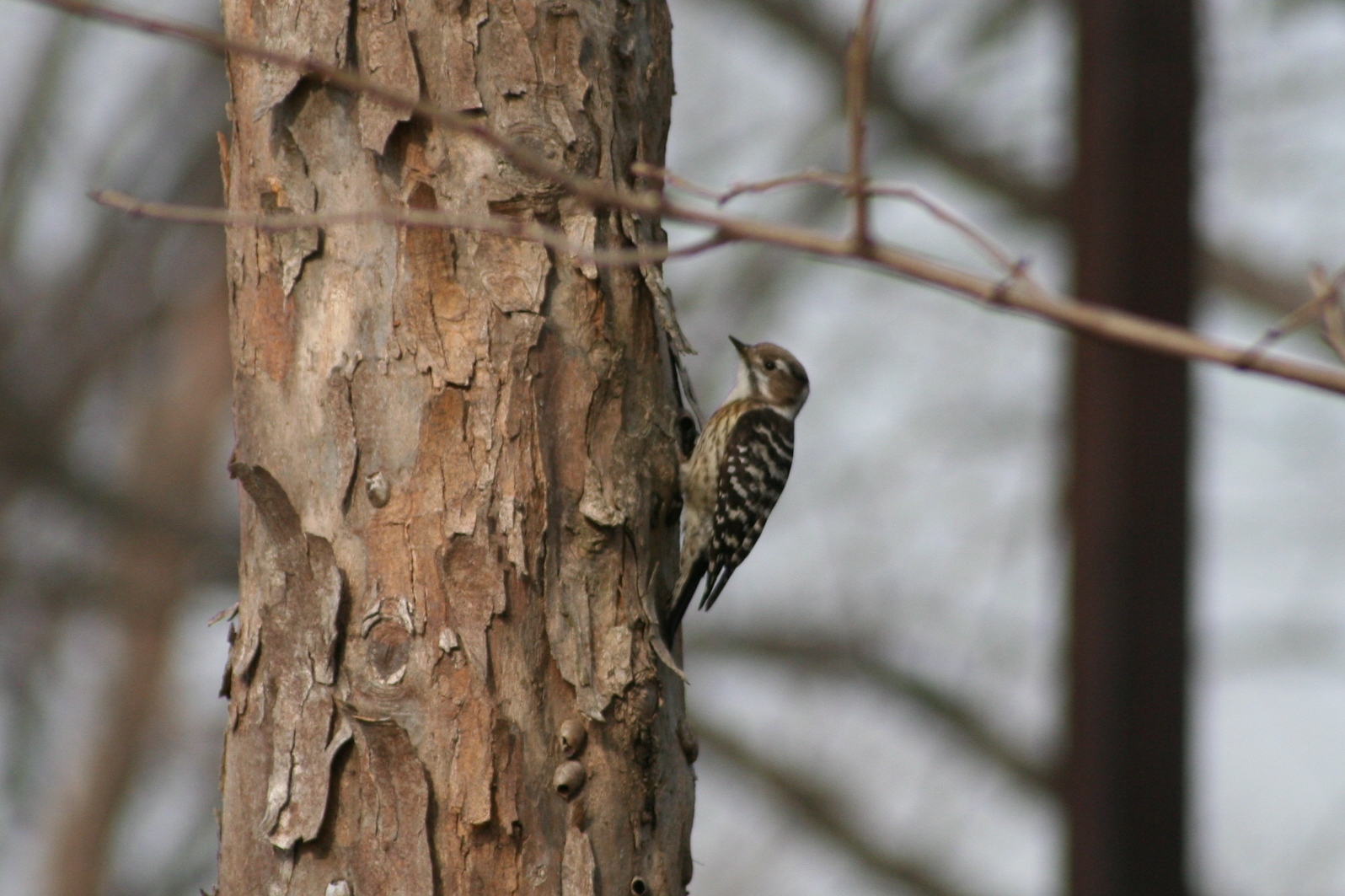 コゲラ小型のキツツキの仲間「コゲラ」も頻繁に現れます。園内を歩いているとシジュウカラの群れにであうことがありますが、そんな時「ギー」という鳴き声が混じっていたらコゲラがいます。大きさはシジュウカラとほとんど同じくらいですが、木の幹を歩いてときど幹をつついたりしていますので見分けがつくと思います。写真のように背中の縞柄が特徴です。