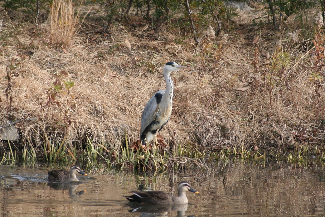 アオサギカワセミが現れたリスザルの池のとなりの大きな池には毎日アオサギが来ています。いる場所は毎日同じところのようですネ。いっしょにコサギやチュウサギも来ていることが多いようです。そして池の水面にはカルガモやマガモがいますョ。