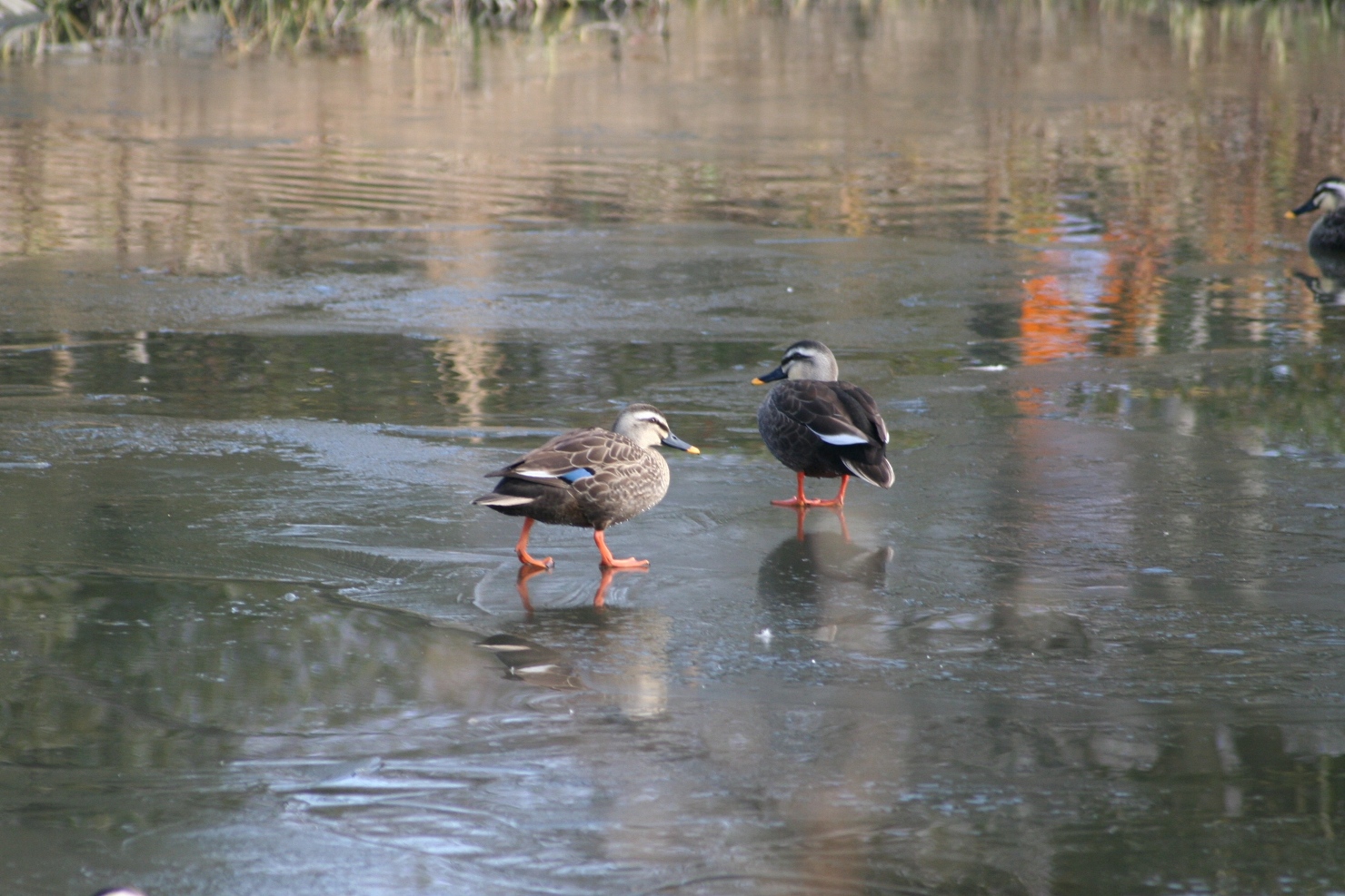 氷とカルガモ成人の日を含む連休ですが、冷え込みましたね〜。昨日の日曜日は北風が強くて寒い一日でしたし、今朝は風はおさまったものの厳しい冷え込みとなっています。園内の池でも浅いところは凍っています。その氷の上をカルガモがおっかなびっくり歩いていました。