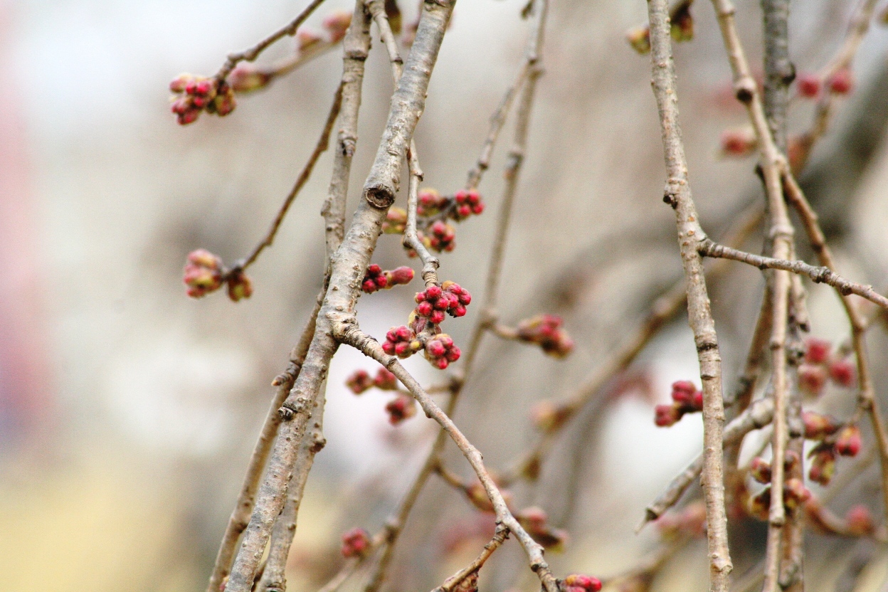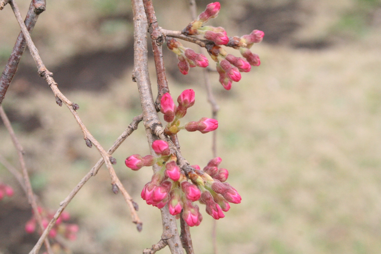 G’sレストラン前のカンヒザクラもようやく開花しました。遠くから見ても赤い色が目立ってきましたね。もうひとつサクラで早咲きなのがハッピーオンステージにあるシダレザクラです。下右の写真のようにつぼみがきれいなピンクに膨らんできています。
