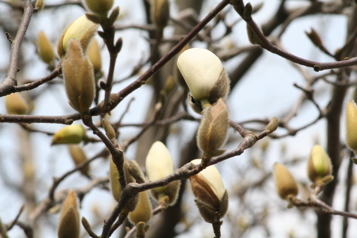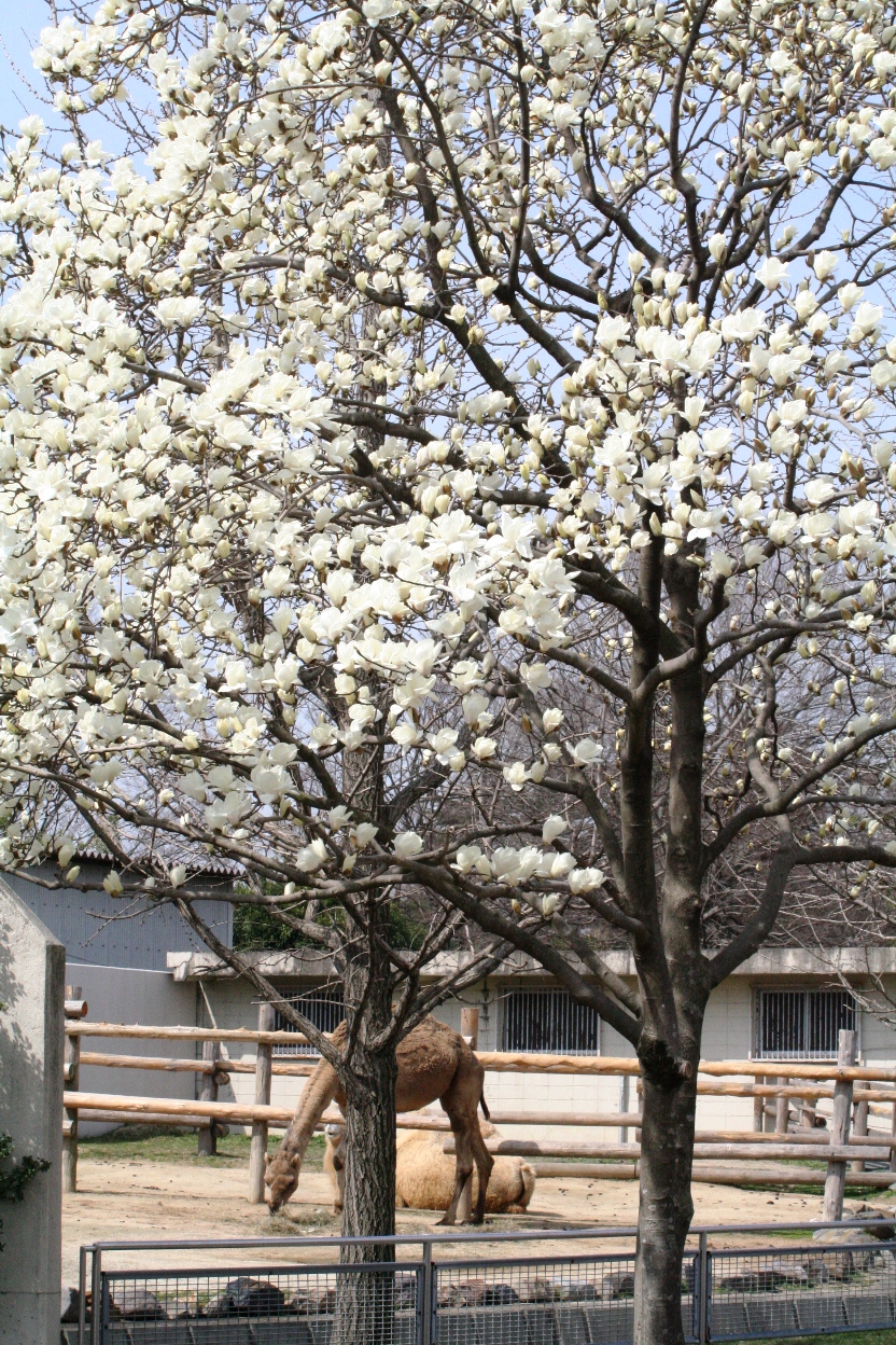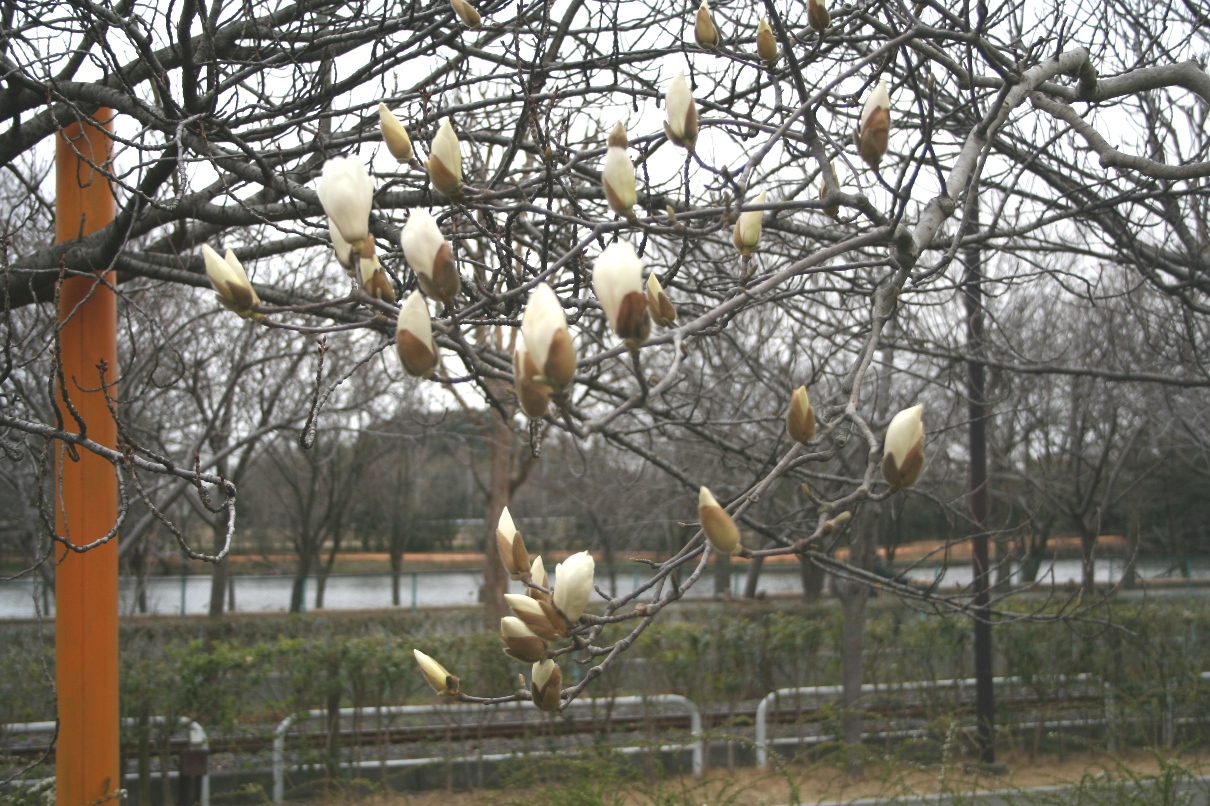遊園地のコブシも3分咲きくらいになりました。東ゲートの脇にも株立ちのコブシの大木があるのですが、こちらはつぼみの数も少なくまだ固いようです。