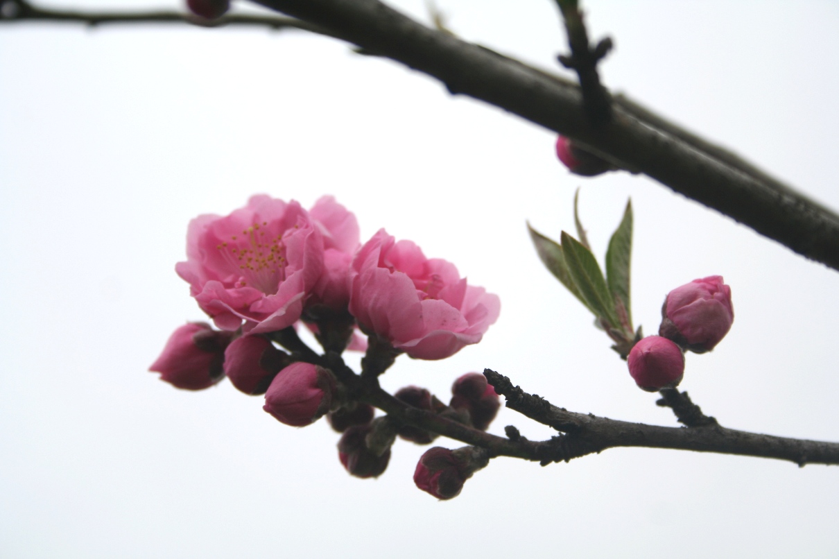 傘をさしつつ桃の花と桜の蕾の様子を見に