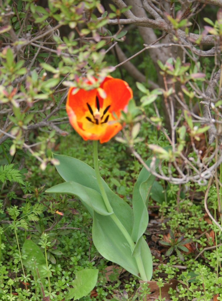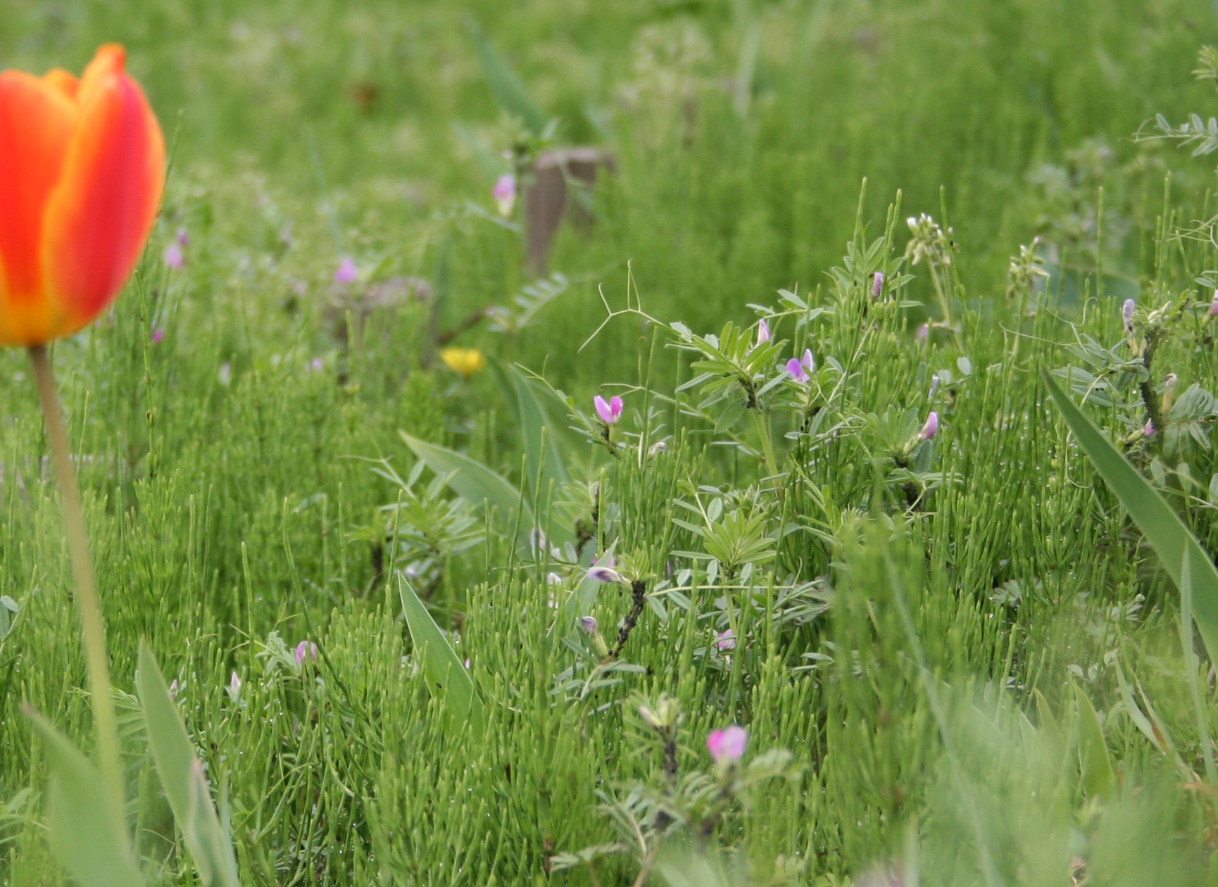 野草(バックチューリップ) 隠れチューリップ東ゲートカバ像の裏側付近で撮影した写真です。紫の野草に春を感じ、目線を合わせて観ていたところ、植え込みの隙間で野生化したチューリップが育っていました。ひとり悠々暮らしていたところへちょっとお邪魔して写真を撮らせてもらいました(笑)