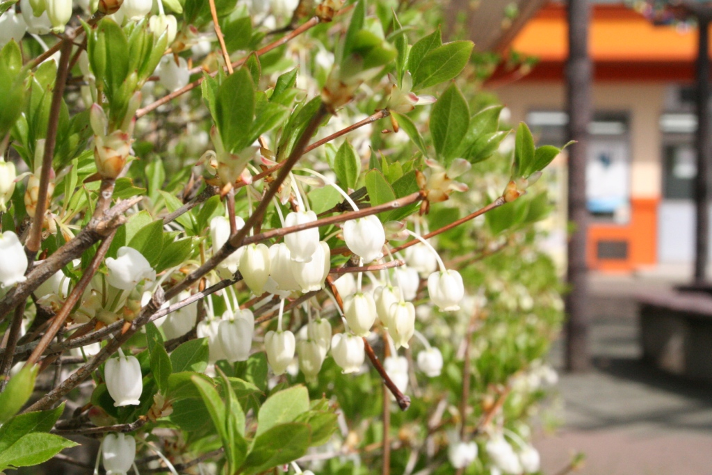 まず、比較的園内のどこでも見られるのがドウダンツツジです。写真は東ゲートで撮影しました。私は、このちいさな鈴のような形からはツツジ科の花とは判らず、周りの職員に聞き回ってしまいました...名前を聞いて、どこかで聞き覚えがあるなと思ったら、東ゲート外の植え込みに、しっかり植物の名前プレートが付いていました(笑)