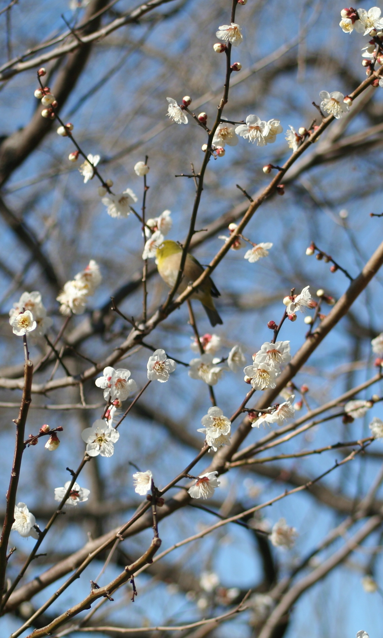 変わってこちらは前回もご紹介したハッピーオンステージそばの梅の花です。ウメ近景(ハッピーオン) ウメとメジロメジロが梅の蜜をつついていたのが可愛らしかったので撮影しました。