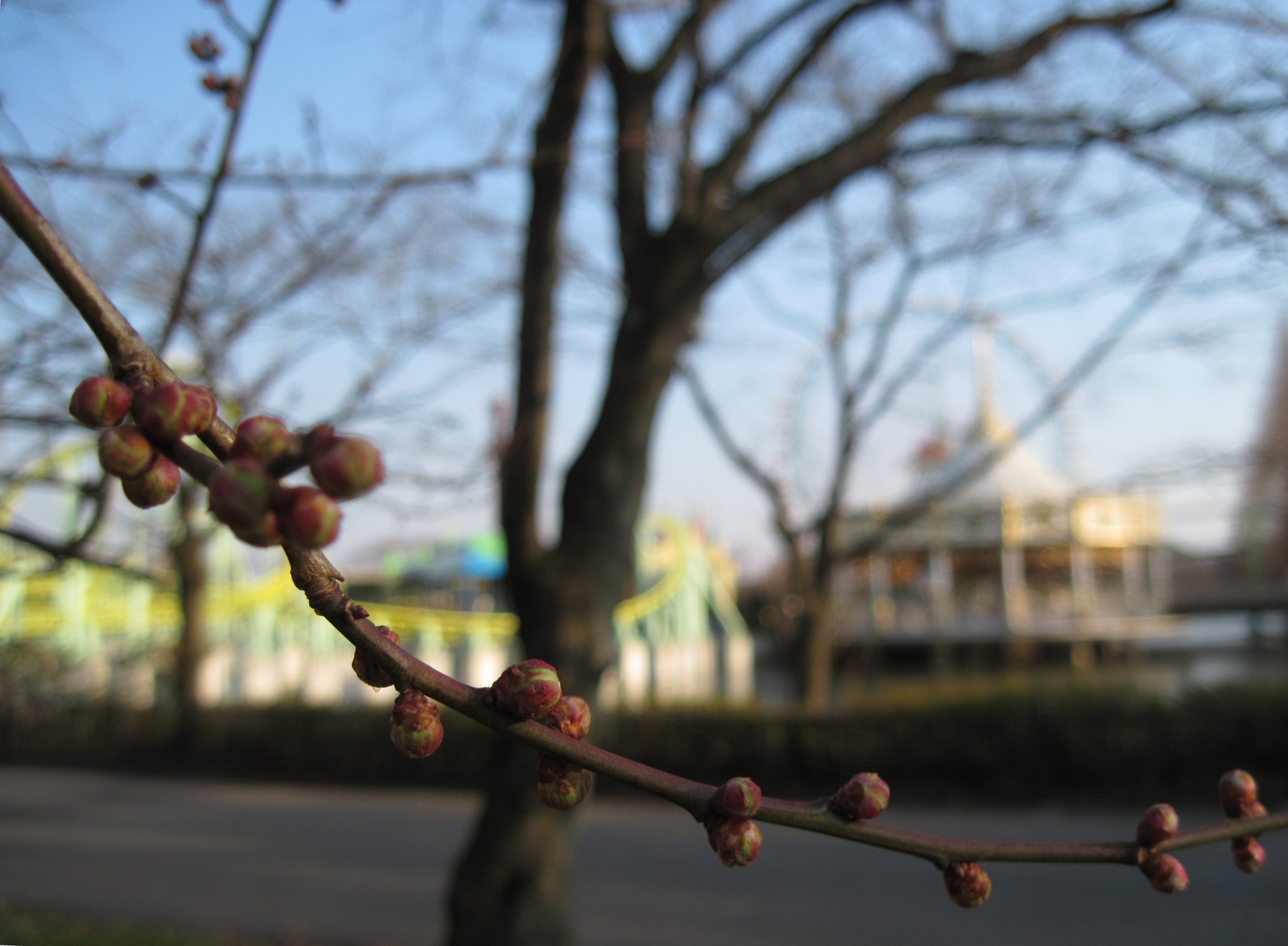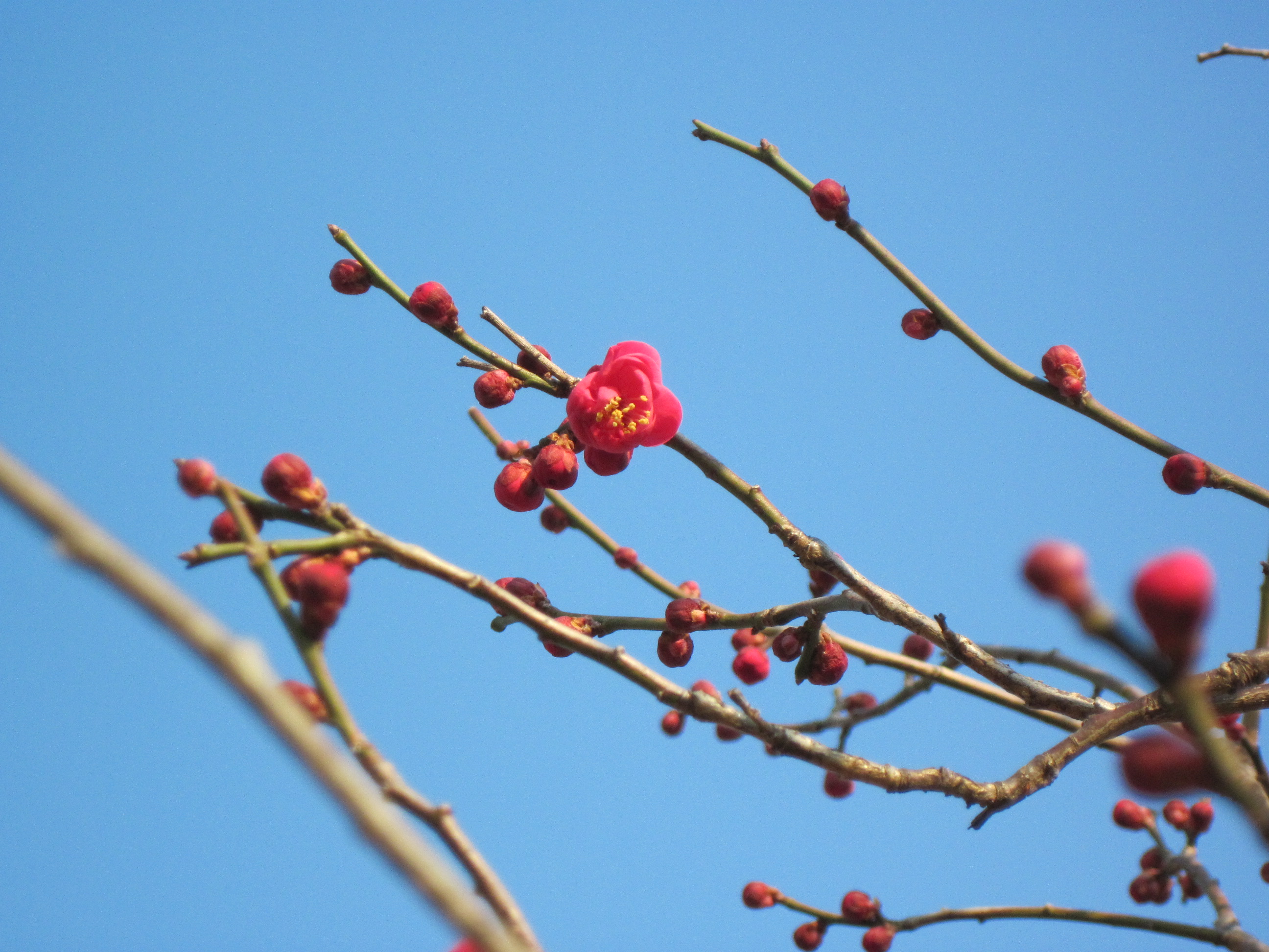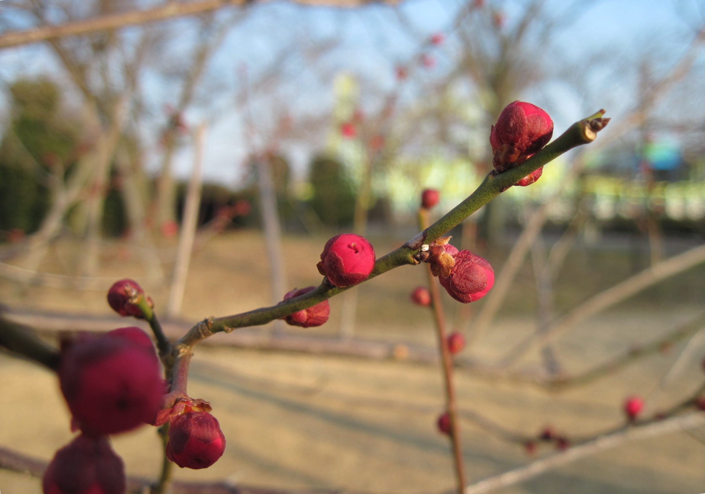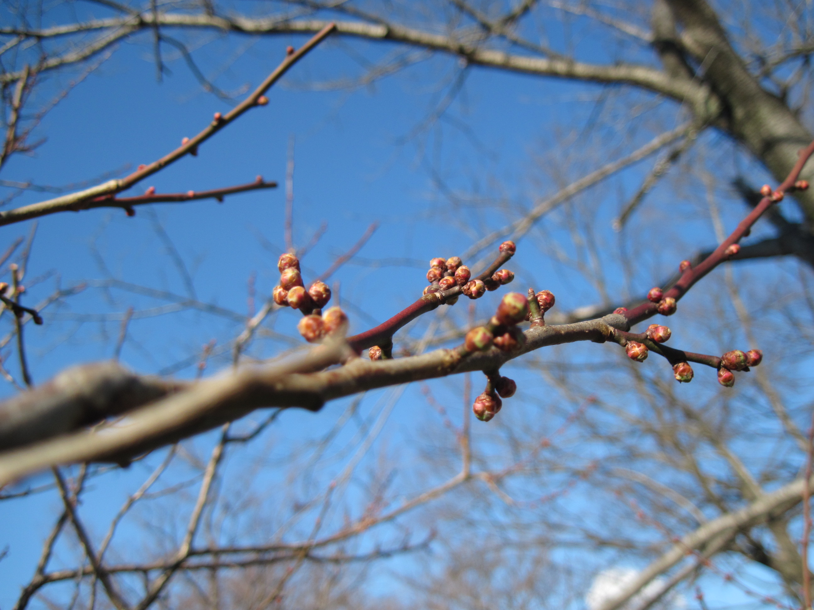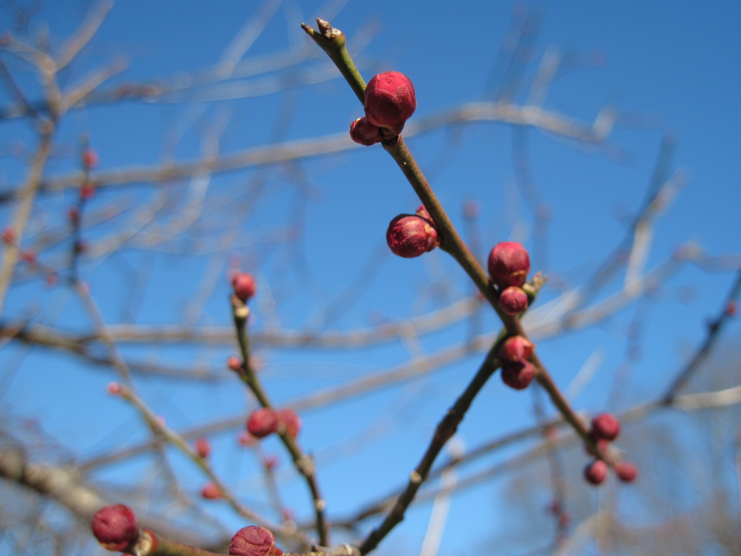 冬の寒空の下、日に日に育つウメの花にほんわか癒されますね