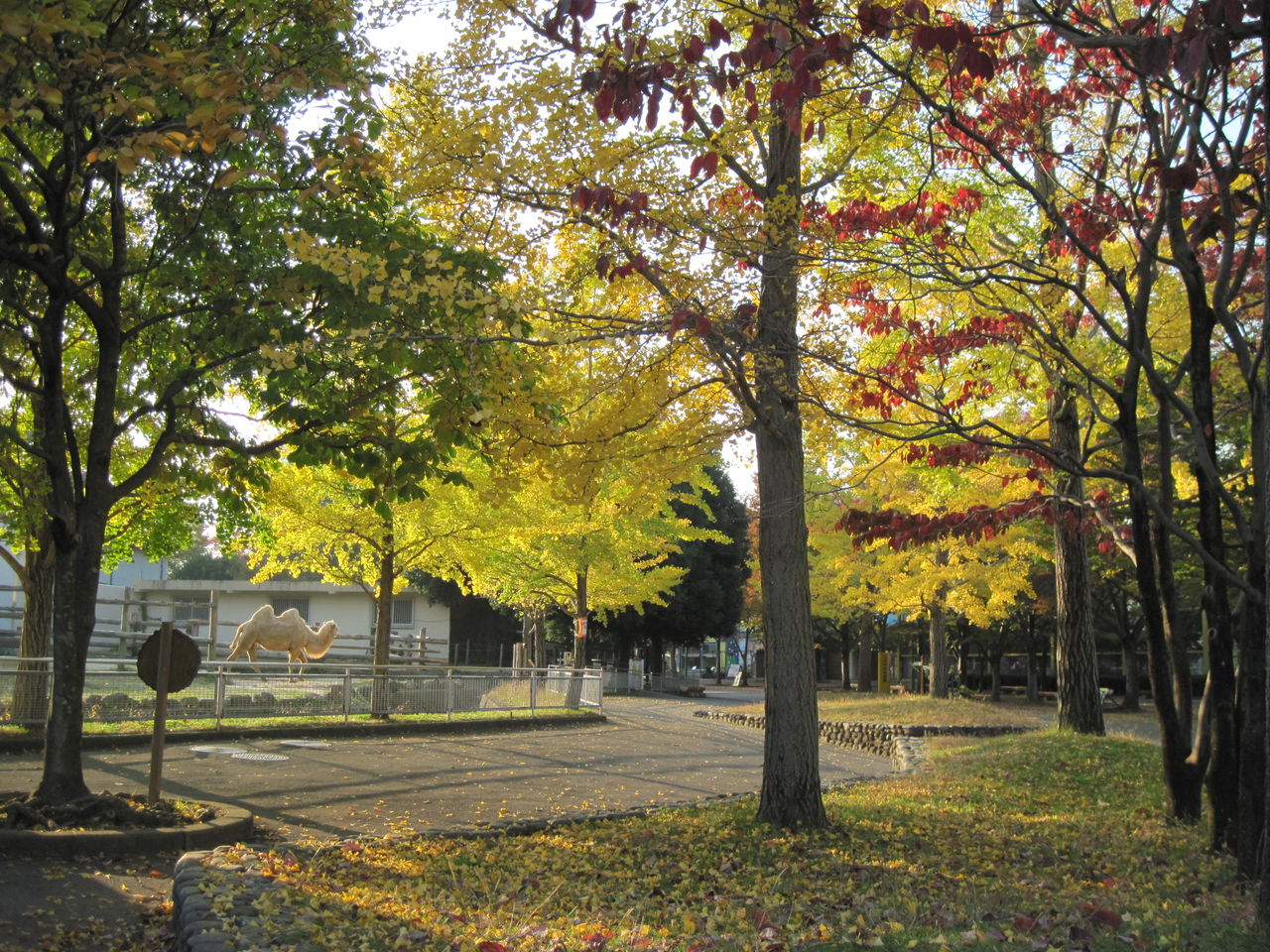 さて、モンキーワールド、リスザルの楽園、そしてラクダ舎までの一本道は今ちょうどケヤキが赤く色づいてきて、とてもキレイになっています