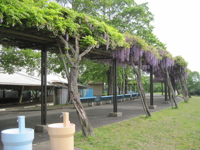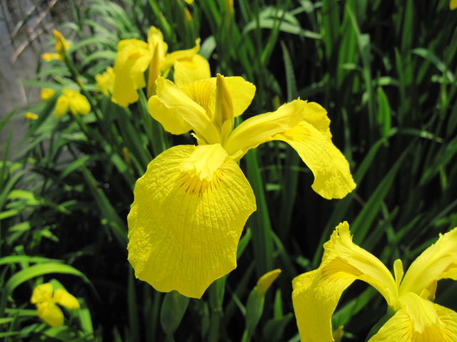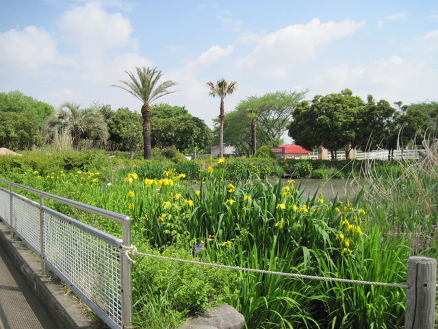 中央レストランそばの池では、キショウブ、菖蒲の花が開花しています