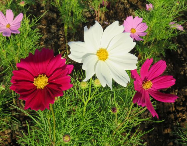 ピンクや白、紅色など色とりどりで、つぼみも次々に開花していて