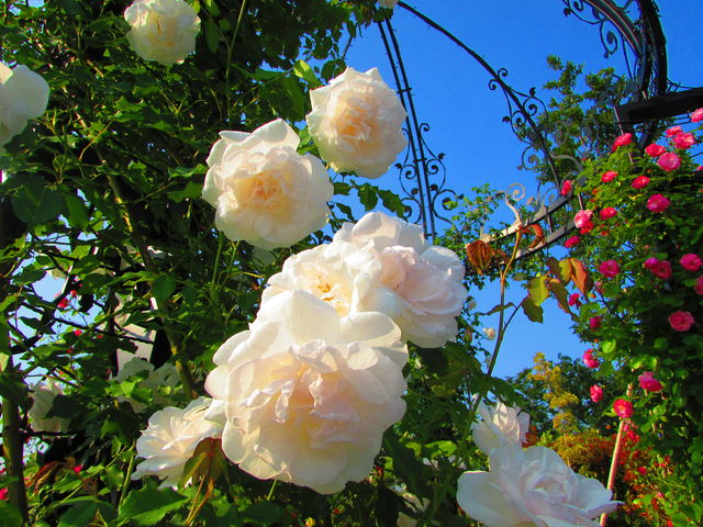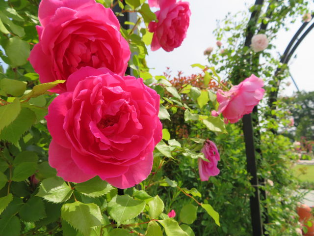 入口の蔓バラの、濃いピンク、薄いピンクの2種類のうち、