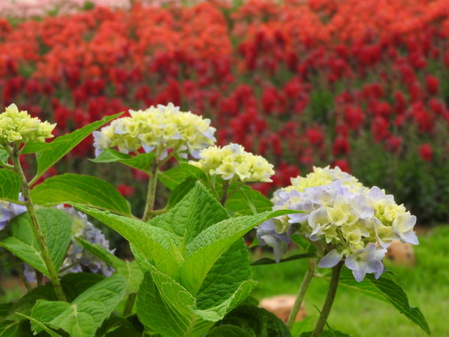 キンギョソウの隣に咲いているアジサイが少し開花していました。