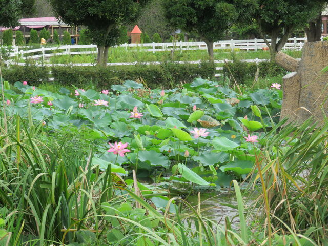 その後ろの池では