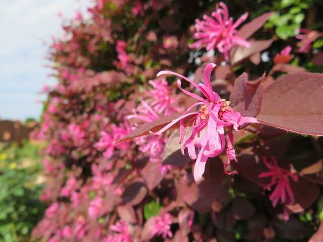生垣ではピンク色のトキワマンサクの花が満開ですので