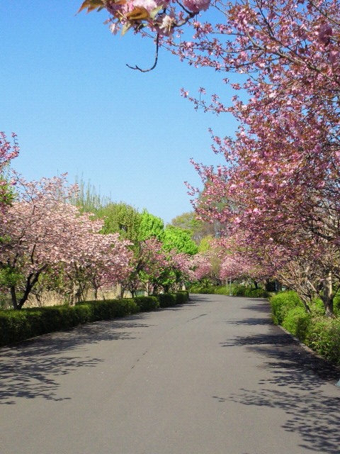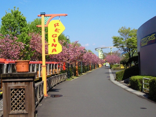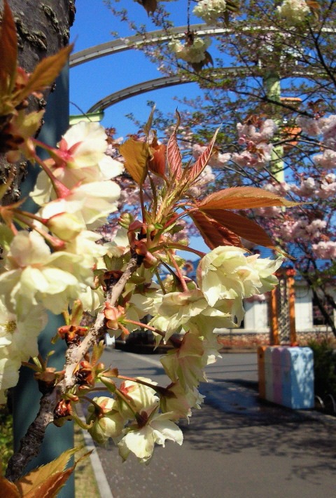 ちなみに遊園地ゾーンのこの辺りには、ヤエザクラの中に1本だけ、なぜか黄色の桜(ギョイコウ?)が混じっています