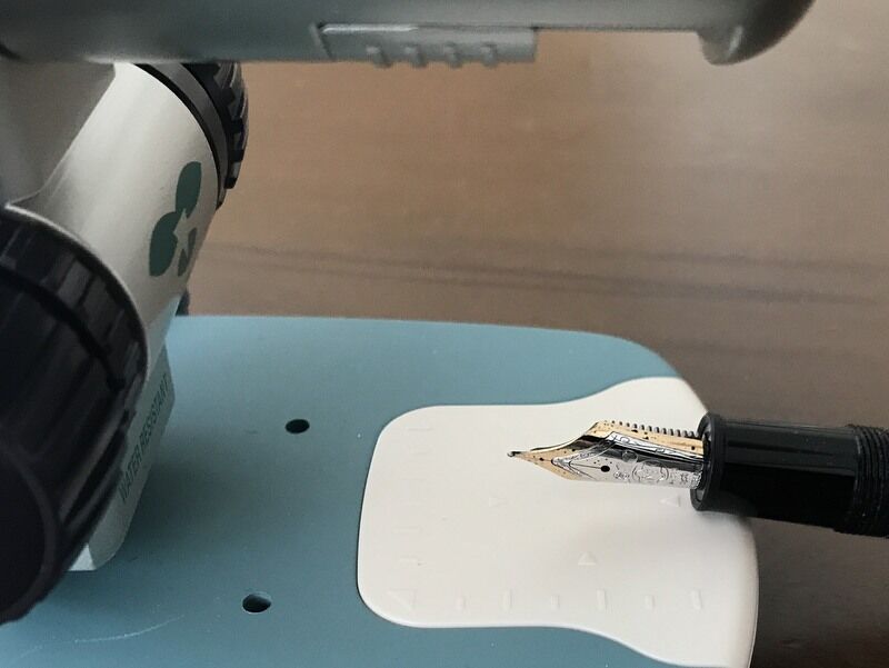 で、早速、愛用しているモンブランの万年筆のペン先を覗いてみましたが、写真ではあまり面白くないですね(苦笑)。ただ肉眼では双眼であることもあり、凄い迫力ですよ。