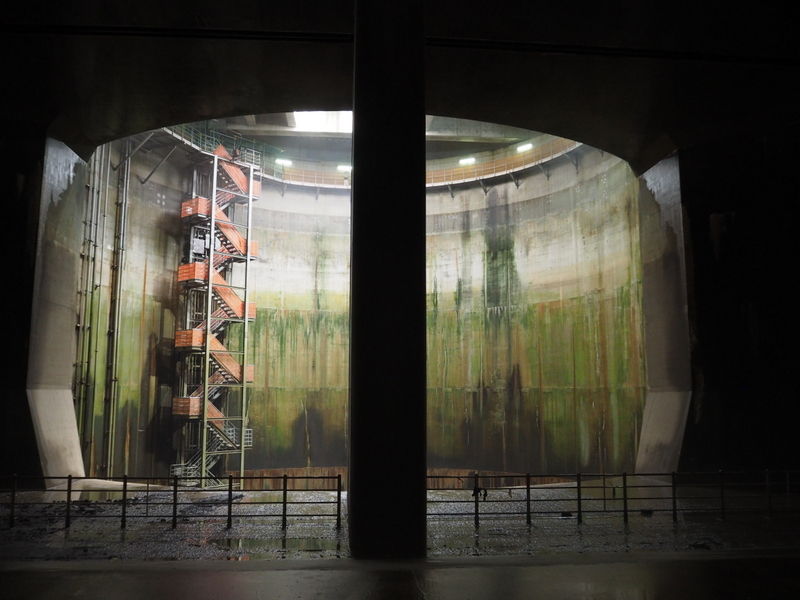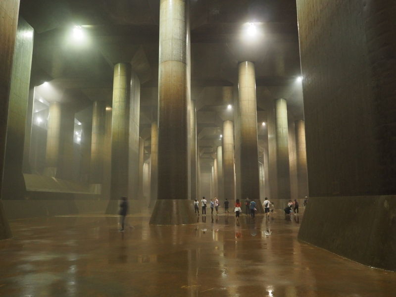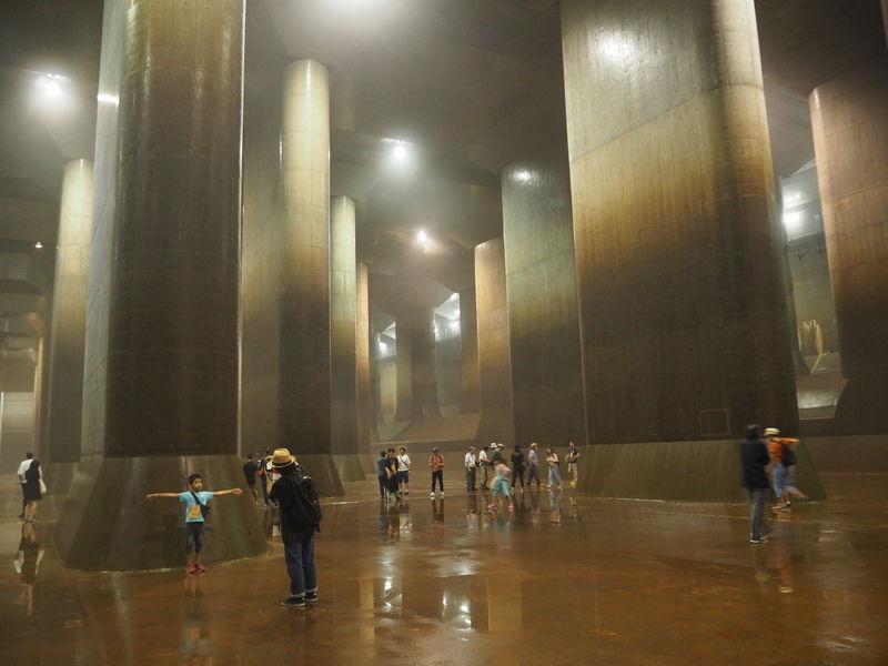 さて、地下神殿です。首都圏外郭放水路は中川や古利根川などの増水時に、水を引き込み江戸川へ排水する地下の巨大水路。これにより埼玉や東京の河川反乱を防いでいます。地下神殿と呼ばれる調圧水槽は、その地下水路に流入した水の勢いを弱め、スムーズに排水するための巨大プールです。