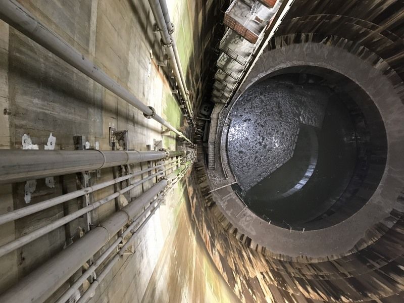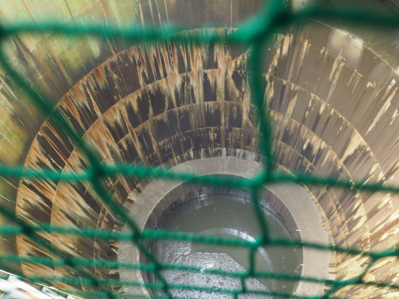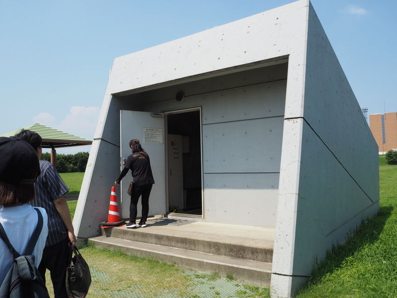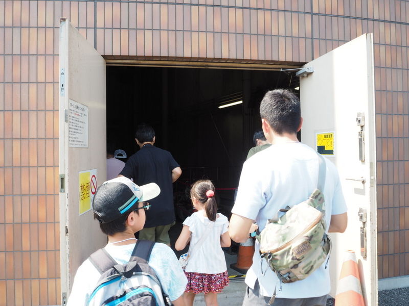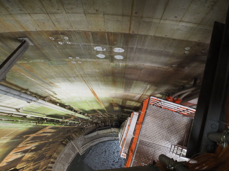 なんと立坑を上から眺めさせてもらえるとのこと。以前の一般公開では立坑見学はありませんでしたから、これは嬉しいサプライズです。いったん地上を上がって、立坑の地上設備から下を眺めます。