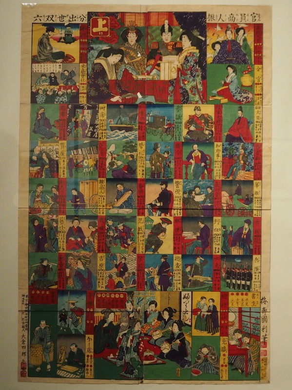 で、そこで展示されていた出世双六。描かれている職業を見るに、上段へ行くほど出世の道のようですが、なぜか警視や裁判官より質屋が上に描かれています。これは図像学的にはどのように解釈すればよいのでしょうか(笑)