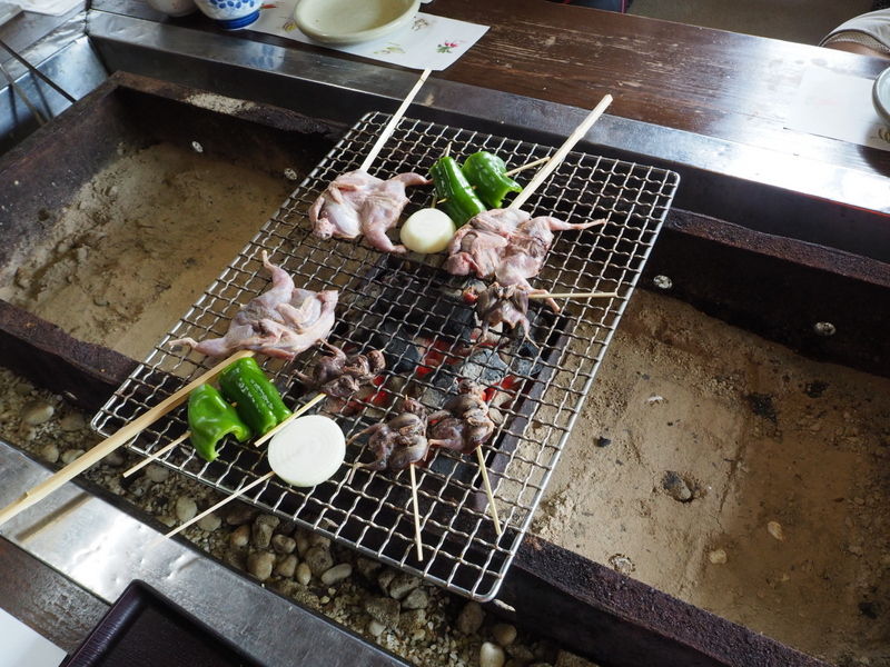 野鳥焼きと言っても、私が食べたのはスズメのみ。麦とろろ定食に単品のスズメ焼きの組み合わせです。トダさんとマツモトさん、スズメとウズラなどを焼く野鳥焼きコース、スギモトさんは麦とろろ定食と単品のウズラ焼きの組み合わせでした。