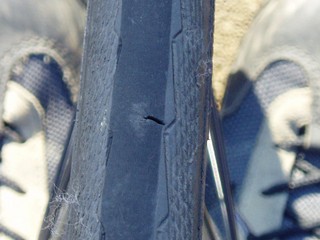 実はこの傷、この前にチューブを替えた時に見つけていました。しかし「まあ大丈夫だろう」といつものアバウトさで、そのままにしていたのが大きな間違い。この傷の穴に、道路に落ちていた細かいガラス片をもらい、チューブを痛めてパンクしたのです。