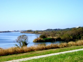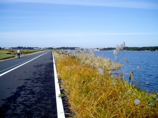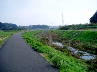 10月30日のエントリーのkashiwanさんのコメントにお答えしたように、免許センター付近で坂川に合流する富士川の土手の道(写真)を南下し、行き止まりまで走ったら、北小金駅方面を目指します。線路に一番近い道路を走ると、その道路は線路からやがて離れていきますが、かまわず走って、信号のある交差点を左折します。坂を下り、しばらく走ると新松戸駅に行けます。
