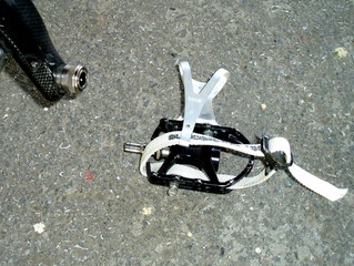 ペダルから足を離すと、トークリップ側が重さで必ず下を向きますから、はめるときにはいちいちペダルをひっくり返さなくてはなりません。SPDペダルに比べて面倒くさい上、結構怖いです。以前はそんなこと思わなかったのですが、SPDペダルに慣れると旧型の固定法という感は否めません。SPDシューズが乾く来週には、再びSPDペダルに戻します。もうトークリップは使えないですね。