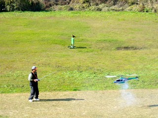 タカ2 実は、このタカ、暢気にラジコンヘリを見ている場合じゃなかったのですね。50mほと離れたところで、トレーナー(鷹匠?)の女性が戻って来るように呼んでいました。しかし、タカ君は一切無視。大物なのか、バカなのかは分かりませんが、全く動く気配を見せませんでした。しかし、やがてトレーナーのところへ低空飛行で戻っていきました。