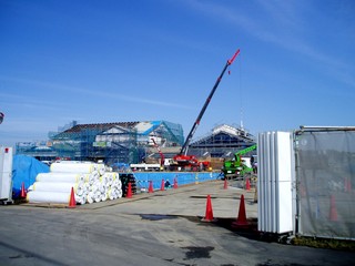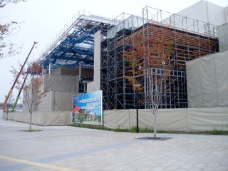 うーん、建物はなかなか美しい仕上がりなのではないでしょうか。自動車の導線もうまく設計してあり、これなら大渋滞はおきないでしょう。今回は、自然の調和がどうだなんて堅いことは言いません(笑) やはり現地を訪ねると、オープン前のワクワク感が伝わってきますねぇ。
