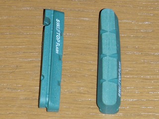 このスイスストップのシュー、色によって性能が違い、今回買った緑のやつはドライだけでなくウェット(つまり雨の時)でもよく効くらしいです。でも値段もメチャクチャ高い。定価ならシマノのDURA-ACEブランドのシューの3倍もします。こりゃ定価では買えません。本来、私の実力なら、こんなシューはいらないのですが、この手のものに弱い私(苦笑)。「安全はお金に代えられない」などと理屈を付けて購入しました(だったら、とっととワイヤーを交換せい!)。