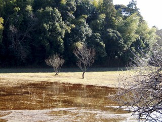 湿原3 そして月曜日は、またもや「布佐から古利根沼、傾斜林北側の農道」を走ってきました。このコースは最近かなりマイブームです。これまで東葛地域で走った傾斜林脇の道の中で、ここの傾斜林が一番美しい気がします。あの湿原も土曜日の雨で一面に水をたたえ、それが冬の日差しに光輝いていい感じでした。