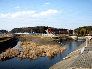 富士見橋からおおたかの森駅へ向かうのは、実質的に坂川の源流である導水路の西端を横目に、田園地帯を北上します。この導水路は利根川から江戸川に注ぐ坂川を結ぶ地下水路で、実は手賀沼サイクリングロードに沿って埋め込まれています。手賀沼に利根川の比較的きれいな水を供給したり、洪水の恐れがあるときに手賀沼の水を利根川や江戸川に放出したりする水路ですので、坂川にあふれ出している水は元をたどれば利根川の水なんですね。