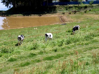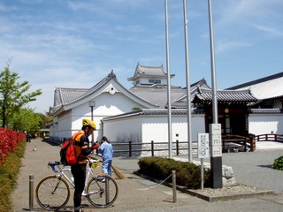 二人とも東葛地域とは縁もゆかりもない人たちなので、私が案内役に。まあ定番を押えようということで、JR常磐線の松戸駅にまで来てもらい、そこから江戸川サイクリングロードを北上し、関宿城を目指しました。途中、例の牛さんたちに「おお! 牛がいる!」とお約束の反応。そして関宿城に到着(ちなみに関宿城の手前に写る少し怪しげなおじさんが監督です、笑)。