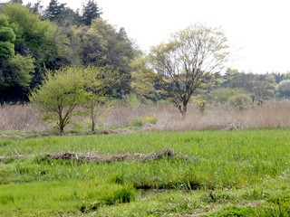 で、どこへ出かけていたかと言うと古利根ルート。そろそろ田んぼに満々と水が入り、傾斜林の緑と相まって美しいだろうと思い、出かけました。ところが、今年はまだ田んぼに水が入りきっていません。あんなに暖冬だったのに、4月に入って随分寒くなりましたから、苗の生育が遅れたのでしょうか。