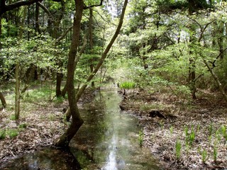 左の写真、傾斜林の中に佇む廃屋のある辺りの田んぼに水が入ると、この廃屋を背景に、とても美しい光景が広がります。今日はまだ水が不十分でしたが、それでも新緑の美しさで十分満足でした。それに輪をかけて美しかったのは、私の大好きな湿地帯。湿原の中に佇む新緑の樹木がなんとも言えませんでした。