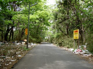 この道は150mほど森の中を走ります。本来なら、とても気分の良い道のはずですが、ほぼ全区間に渡って道の両サイドを不法投棄のゴミが埋め尽くしています。「不法投棄禁止」の看板の周りにも、びっしりとゴミが捨てられていました。しかも、ほぼすべてが家庭から出るゴミです。つまり、普通の人たちがこの道にゴミを捨てているのです。