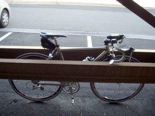 ところで意味不明の写真ですが、これは満天の湯での正しい駐輪の仕方を示しています(笑)。あそこの駐輪場はスタンド付の自転車しか想定していないので、ロードレーサーなどスポーツバイクで訪れた時にちょっと困ります。で、どうするかですが、駐輪場と駐車場を隔てる鉄骨の間に、このように自転車がすっぽり納まります。まるでスポーツバイク専用スペースのように見事なものです。これなら防犯効果もありそうですので、足湯ご利用の際には参考にしてください。